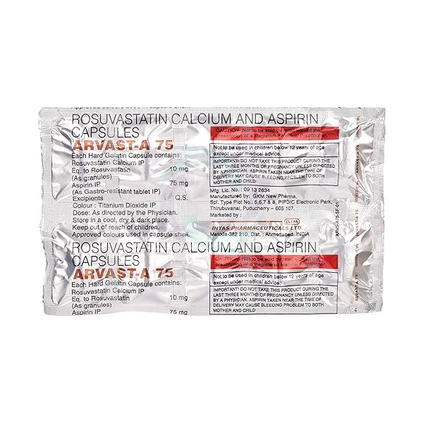 Arvast-A 75 Capsule is a combination of two medicines used to prevent heart attack, stroke, and angina. This medicine reduces the “bad” cholesterol (LDL) and triglycerides (fats) levels. Moreover, it also decreases the formation of blood clots.