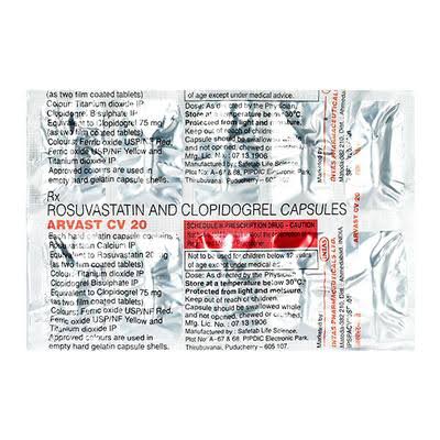 ARvasT CV 20 Capsule is a medicine used to prevent heart attack, angina, and stroke. This medicine reduces the “bad” cholesterol (LDL) and triglycerides (fats) levels. Moreover, it also decreases the formation of harmful blood clots and helps improve heart health.