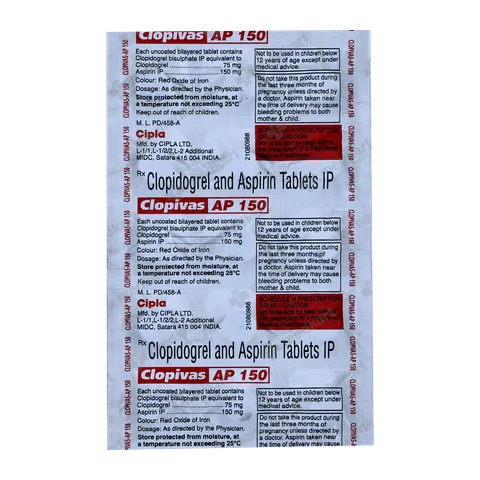 Clopivas AP 150 Tablet is a combination of two antiplatelet medicines or blood thinner used to reduce the formation of harmful blood clots in blood vessels. It is used to prevent a heart attack or stroke in people with heart disease. It is also used to treat acute coronary syndrome (ACS).