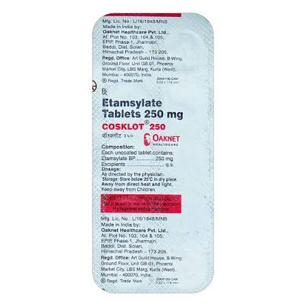 Cosklot 250mg Tablet is used in the treatment of bleeding. It is used to prevent or reduce bleeding in conditions like abnormal blood loss during periods and dysfunctional uterine bleeding. It also prevents or reduces bleeding during, before or after delicate surgeries.