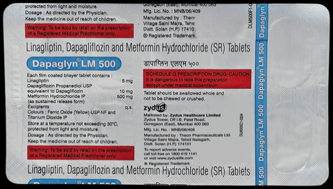 Dapaglyn LM 500 Tablet SR is a medicine used along with proper diet and exercise to lower high blood sugar levels in individuals with type 2 diabetes. It improves insulin sensitivity, reduces glucose production, and increases glucose excretion. It lowers the risk of complications in patients with type 2 diabetes.