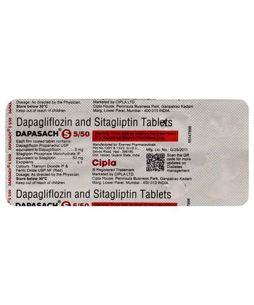 Dapasach S 5mg/50mg Tablet is a combination medicine that helps control blood sugar levels. This medicine is used together with diet and exercise to improve blood sugar control in adults with type 2 diabetes mellitus. It helps in the proper utilization of insulin, thereby lowering the blood sugar level.