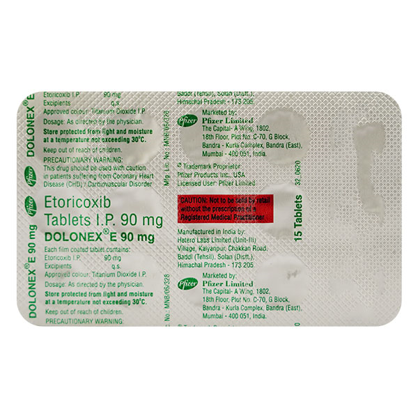 Dolonex E 90mg Tablet is a pain-relieving medicine. It is used for relieving moderate pain and swelling of joints associated with different forms of gout and arthritis. It effectively alleviates pain, redness, and swelling.
