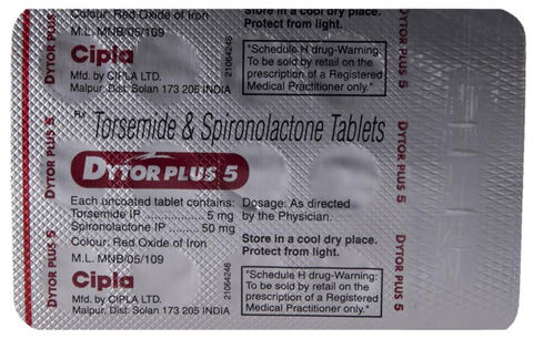 Dytor Plus 5 Tablet is used to treat edema (swelling) caused by conditions such as heart failure, liver disease, kidney disease, or pulmonary edema. It helps the body eliminate excess fluid. It is also used to treat high blood pressure, helping to lower strain on the heart and improve overall circulation