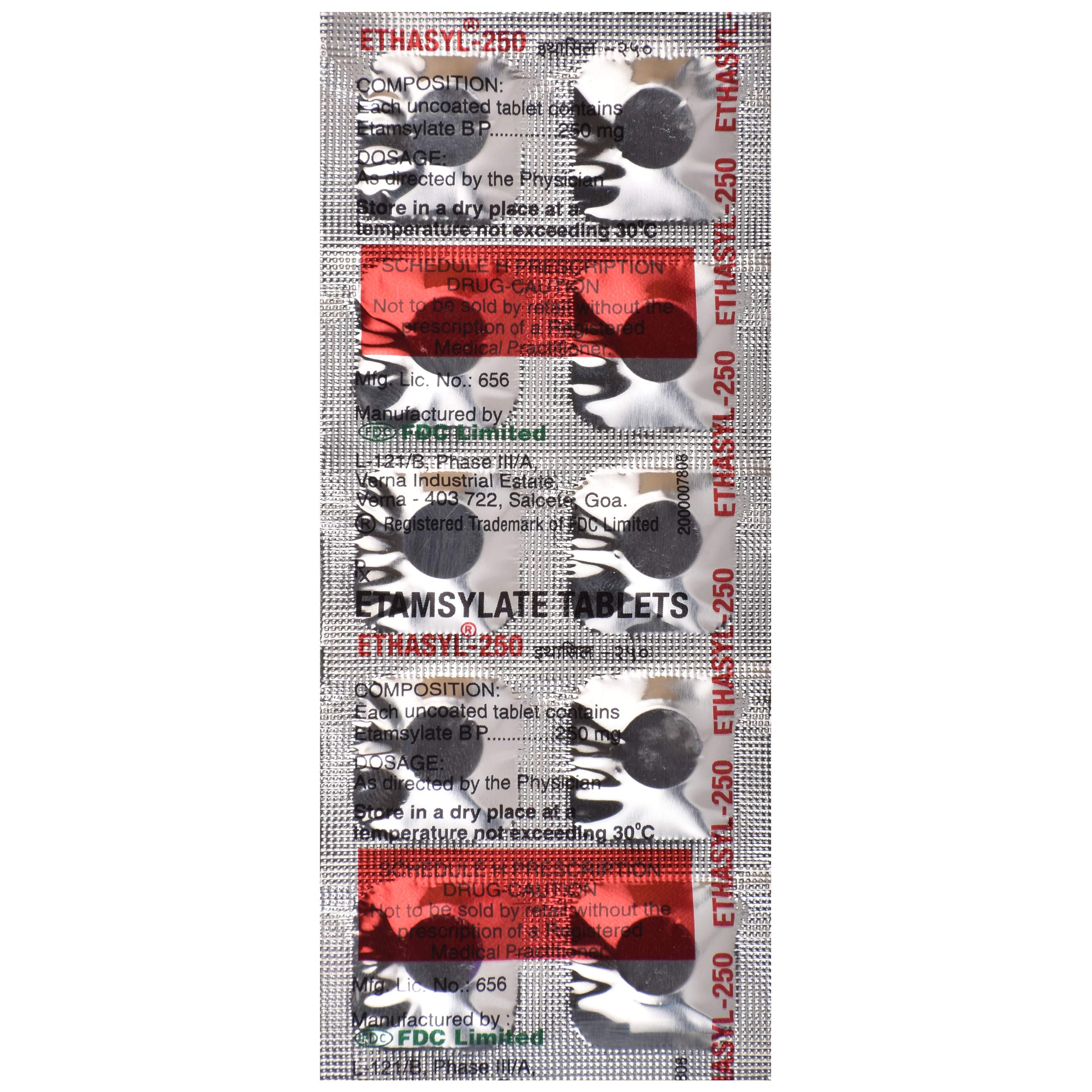 Ethasyl 250 Tablet is used in the treatment of bleeding. It is used to prevent or reduce bleeding in conditions like abnormal blood loss during periods and dysfunctional uterine bleeding. It also prevents or reduces bleeding during, before or after delicate surgeries.