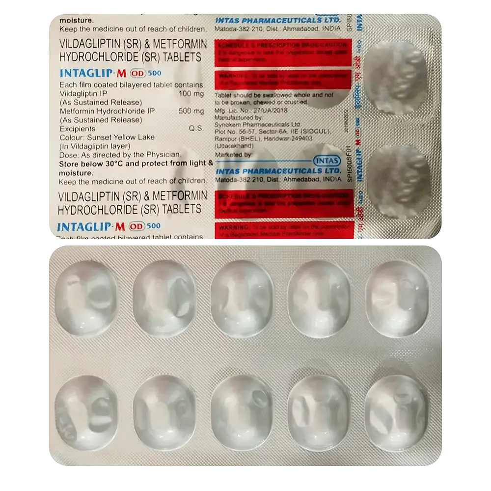 Intaglip-M OD 500 Tablet SR is a combination of two medicines that control high blood sugar levels in people with type 2 diabetes mellitus. This helps prevent serious complications of diabetes, such as kidney damage and blindness, and may also reduce your chances of having a heart attack or stroke.