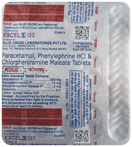 KOLQ Plus Tablet is a medicine used in the treatment of common cold symptoms. It provides relief from symptoms such as headache, sore throat, runny nose, muscular pain, and fever.