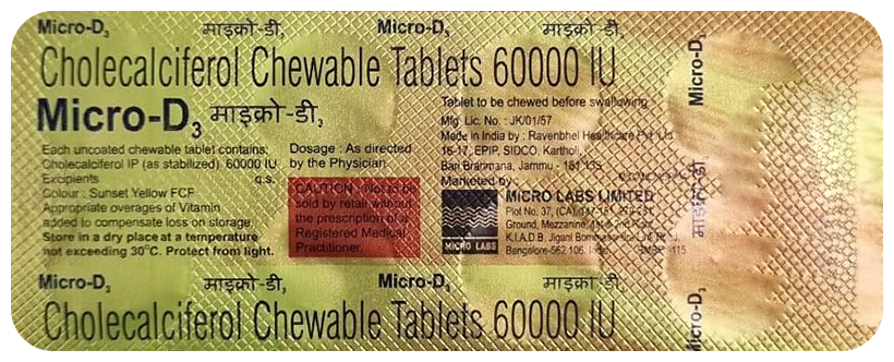 Micro-D3 Chewable Tablet is used in the treatment of vitamin D deficiency and osteoporosis. It helps the body to absorb calcium. Calcium is essential for maintaining strong and healthy bones. It is used when your diet does not provide enough calcium.