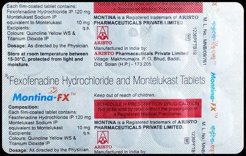Montina FX 10mg/120mg Tablet is a combination medicine used in the treatment of allergy symptoms such as runny nose, stuffy nose, sneezing, watery eyes, and congestion or stuffiness.