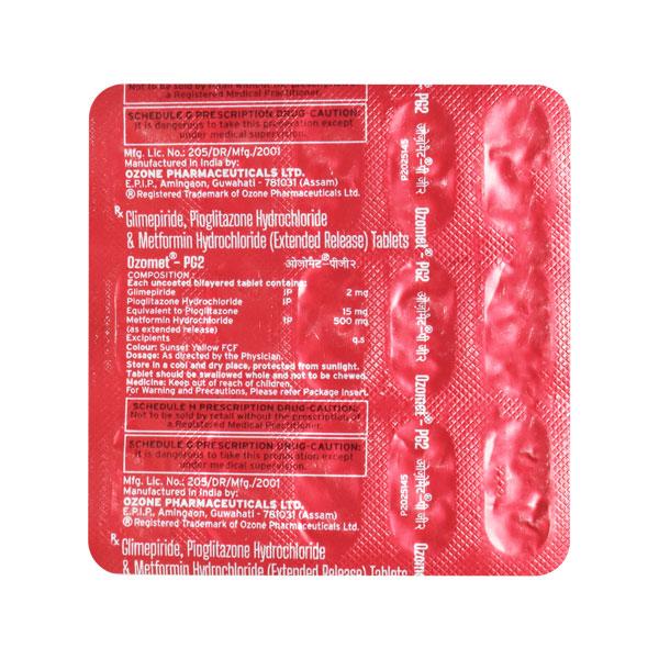 Ozomet-PG 2 Tablet ER is a combination medicine that helps control blood sugar levels. This medicine is used together with diet and exercise to improve blood sugar control in adults with type 2 diabetes mellitus. It helps in proper utilisation of insulin, thereby lowering the blood sugar levels.