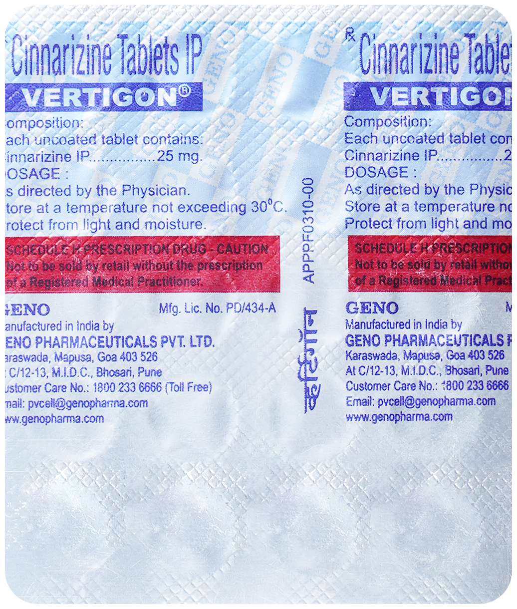VertigOn Tablet belongs to a class of medicines known as antihistamines. It is used to treat motion sickness (nausea due to motion, especially while traveling in a moving vehicle), vertigo (spinning sensation or dizziness), or Meniere’s disease (problems with balance).
