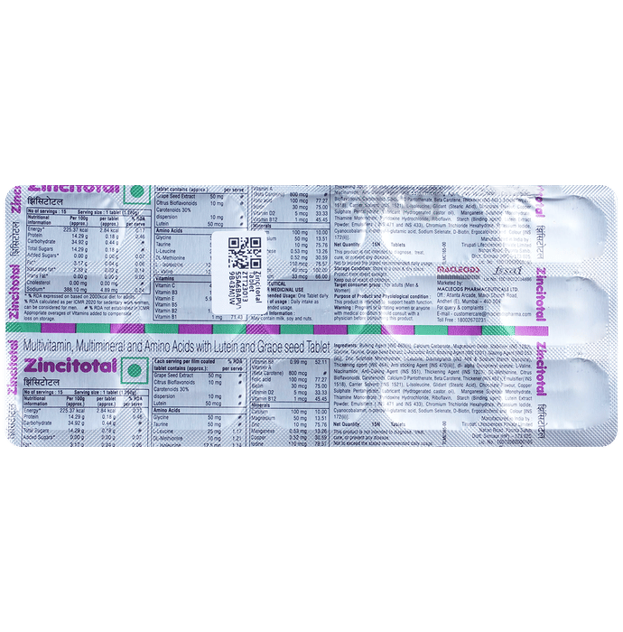 + Free ShippingZincitotal Tablet contains vitamins and minerals which can help improve overall health. It helps to promote and maintain a healthy heart and brain and is a rich source of heart-healthy essential fatty acids.