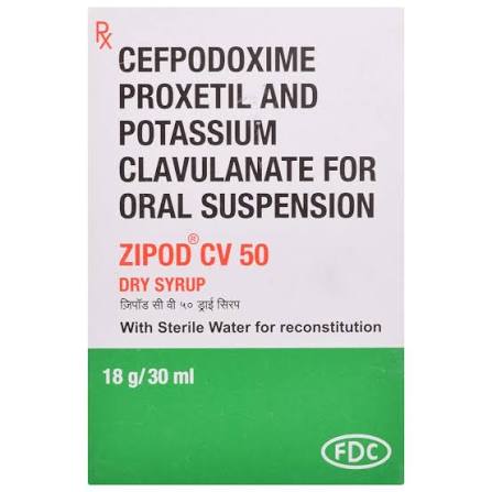 ZIPOD CV 50MG ORAL SUSPENSION is a combination of Cefpodoxime and Clavulanic acid which belongs to the group of medicines called Cephalosporins and Beta-lactamase inhibitors, respectively. ZIPOD CV 50MG ORAL SUSPENSION is used in children to manage mild to moderate infections such as otitis media (middle ear infection), nose & throat infections, respiratory tract infection, urinary tract infection, reproductive tract infection, and skin infection.
